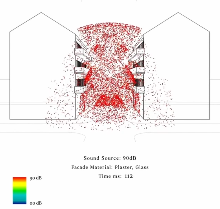 This study investigates the acoustic properties of abstracted urban scenarios through computational simulations. Specifically, it analyzes the potential for building facades to disperse and attenuate urban noise.