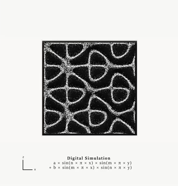 Using physical and computational methods, visualizing different vibration modes through the field of cymatics based on the explorations of Ernst Friedrich Chladni (1756-1827).